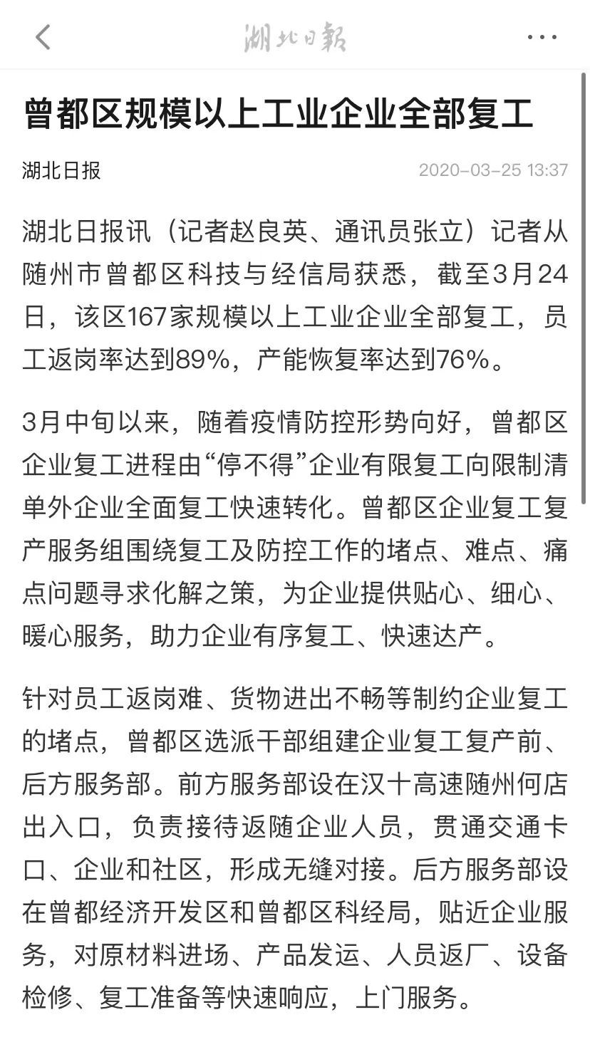 记者从曾都区科技与经信局获悉,截至3月24日,该区167家规模以上工业企业全部复工,员工返岗率达到89%,产能恢复率达到76%。