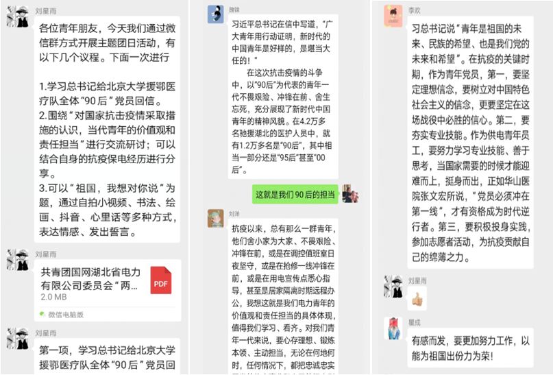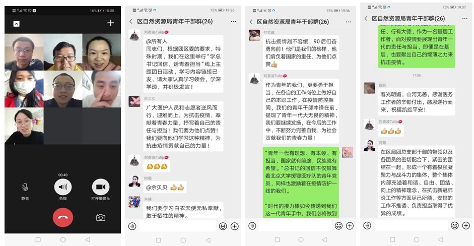 为深入学习贯彻习近平总书记给北京大学援鄂医疗队全体“90后”党员回信精神,凝聚众志成城抗击疫情的强大青春力量,自3月20日以来,团区委积极动员全区各级团组织,广泛开展“学总书记回信,话青春担当”线上主题团日活动。活动以团支部为单位,通过“学习强国”视频会议、微信视频、腾讯视频会议等方式,组织全区青年集中学习习近平总书记给北京大学援鄂医疗队全体“90后”党员回信精神;围绕“对国家抗击疫情采取措施的认识,当代青年的价值观和责任担当”开展交流研讨;团支部成员作“抗击疫情——最令我感动的瞬间”人物、故事分享,表达自己对祖国想说的话、想要表达的情感或誓言。