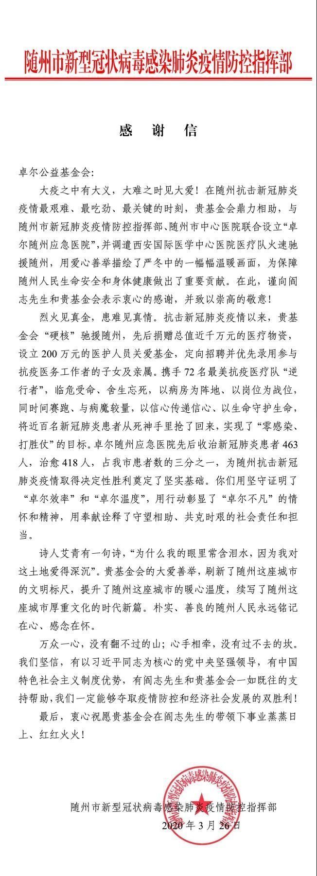 随州市新冠肺炎疫情防控指挥部向卓尔公益基金会发来感谢信。感谢信中说,卓尔随州应急医院以“卓尔效率”和“卓尔温度”驰援随州,为随州抗疫胜利打下了坚实的基础。卓尔各项捐助和关爱彰显了“卓尔不凡”的情怀和精神,诠释了守望相助、共克时艰的责任担当,“朴实、善良的随州人民永远铭记在心、感念在怀”。