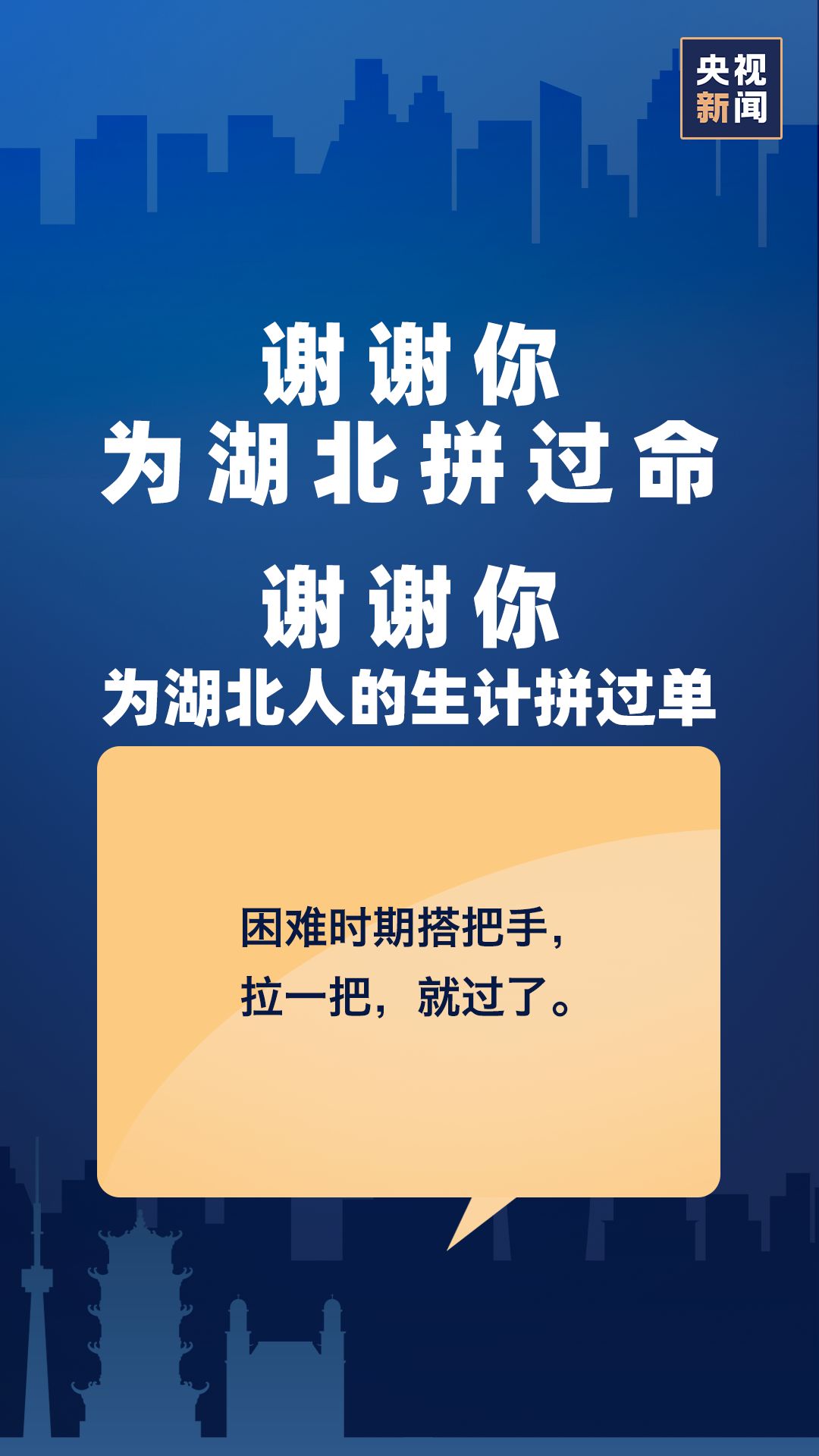 前些天有句话火了,就是送别援鄂医疗队时,大家都说谢谢你为湖北拼过命。今天,如果你“剁手”买了热干面,我还要说一句,谢谢你为湖北拼过单。大家一起搭把手,买“鄂”买起来。困难时期拉湖北一把,湖北也就归队了!