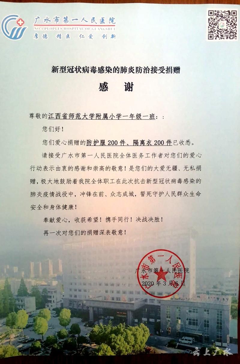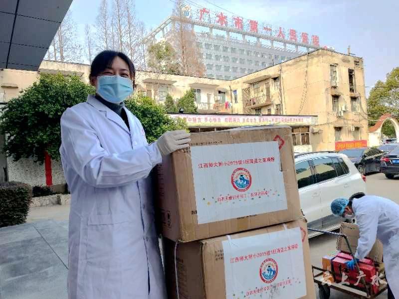 这批防护物资包括200套防护服和200件隔离服,来自于江西师范大学附属小学2019级一年级1班的爱心捐赠。在该校一年级1班的一次网络云主题班会上,老师讲述了前线医护人员抗击新冠病毒疫情故事,医护人员坚守一线的感人事迹深深打动了小朋友们,在班级老师和家长们的帮助和支持下,他们不止用手中的画笔和纯净的歌声为医护人员们送上祝福,更是纷纷拿出自己的零花钱、压岁钱,要为前线医护人员们献爱心。经过班级老师和家长们的多方联络协调,这批饱含着孩子们爱心的防护物资通过邮政免费速递,送到了江西省对口支援城市——随州市广水市第一人员医院抗疫人员手中。