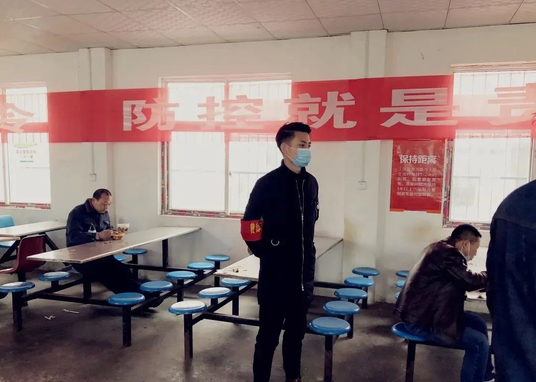 上午,他们戴上安全帽,对厂区、车间、办公楼、洗手间等场所环境卫生和消毒情况进行全面检查,对未佩戴口罩的工人及时劝导改正。