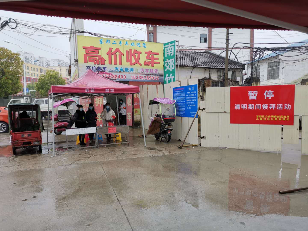 瓜园社区成立祭扫服务专班,自3月28日起,从早上6点到晚上6点,由2名社区班子成员带领工作人员对公墓2处卡口进行管控值守。