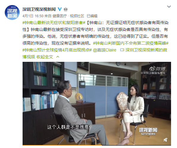 钟南山在接受深圳卫视专访时,谈及无症状感染者是否具有传染性、有多强的传染。他说,无症状患者有明确的传染性,这已经得到了证实。但是否有很高的传染性,现在没有证据来说明。