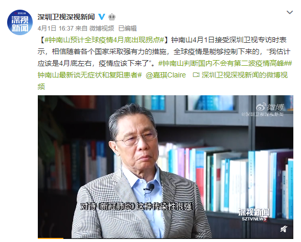 钟南山预计全球疫情4月底出现拐点