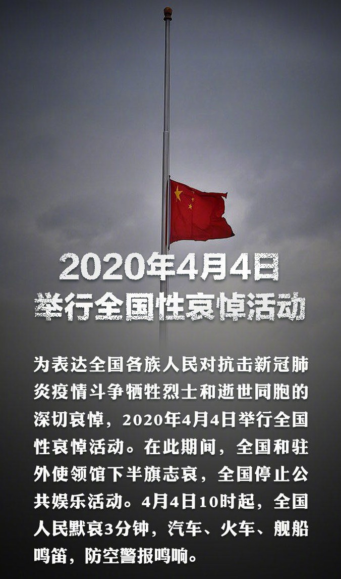 为表达全国各族人民对抗击新冠肺炎疫情斗争牺牲烈士和逝世同胞的深切哀悼,国务院发布公告,决定2020年4月4日举行全国性哀悼活动。