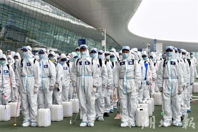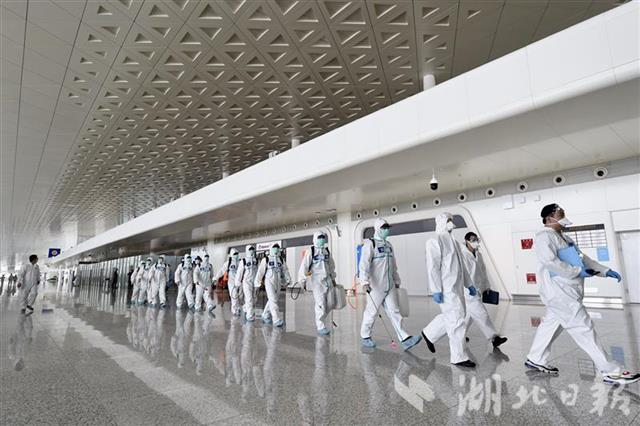 2020年4月3日下午,武汉天河国际机场T3航站楼进行封闭式卫生防疫消杀作业,武汉市消防救援支队派出161名队员执行此次任务,作业面积近57万平方米。根据中国民用航空局相关通知,自4月8日零时起,武汉天河国际机场国内客运航班将恢复运营。此次消杀作业为营造安全健康的乘机环境,做好全面复航准备。