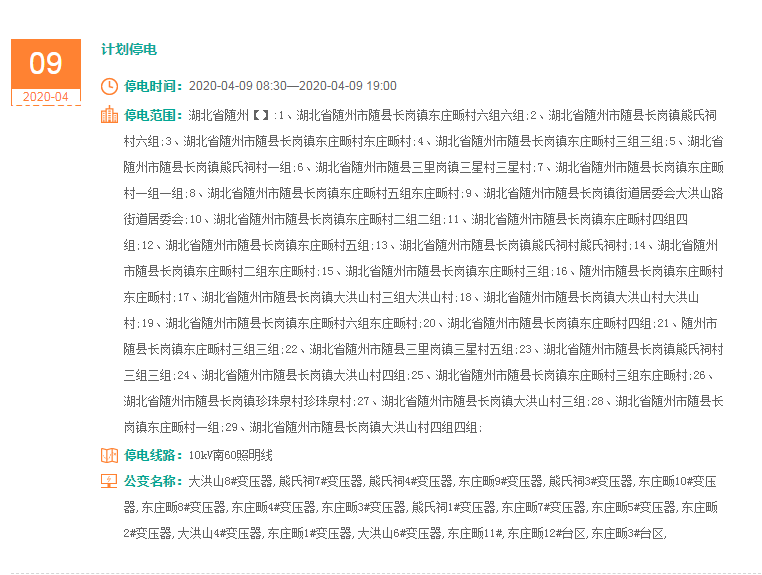 停电范围:湖北省随州:1、湖北省随州市随县长岗镇东庄畈村六组六组;2、湖北省随州市随县长岗镇熊氏祠村六组;3、湖北省随州市随县长岗镇东庄畈村东庄畈村;4、湖北省随州市随县长岗镇东庄畈村三组三组;5、湖北省随州市随县长岗镇熊氏祠村一组;6、湖北省随州市随县三里岗镇三星村三星村;7、湖北省随州市随县长岗镇东庄畈村一组一组;8、湖北省随州市随县长岗镇东庄畈村五组东庄畈村;9、湖北省随州市随县长岗镇街道居委会大洪山路街道居委会;10、湖北省随州市随县长岗镇东庄畈村二组二组;11、湖北省随州市随县长岗镇东庄畈村四组四组;12、湖北省随州市随县长岗镇东庄畈村五组;13、湖北省随州市随县长岗镇熊氏祠村熊氏祠村;14、湖北省随州市随县长岗镇东庄畈村二组东庄畈村;15、湖北省随州市随县长岗镇东庄畈村三组;16、随州市随县长岗镇东庄畈村东庄畈村;17、湖北省随州市随县长岗镇大洪山村三组大洪山村;18、湖北省随州市随县长岗镇大洪山村大洪山村;19、湖北省随州市随县长岗镇东庄畈村六组东庄畈村;20、湖北省随州市随县长岗镇东庄畈村四组;21、随州市随县长岗镇东庄畈村三组三组;22、湖北省随州市随县三里岗镇三星村五组;23、湖北省随州市随县长岗镇熊氏祠村三组三组;24、湖北省随州市随县长岗镇大洪山村四组;25、湖北省随州市随县长岗镇东庄畈村三组东庄畈村;26、湖北省随州市随县长岗镇珍珠泉村珍珠泉村;27、湖北省随州市随县长岗镇大洪山村三组;28、湖北省随州市随县长岗镇东庄畈村一组;29、湖北省随州市随县长岗镇大洪山村四组四组;