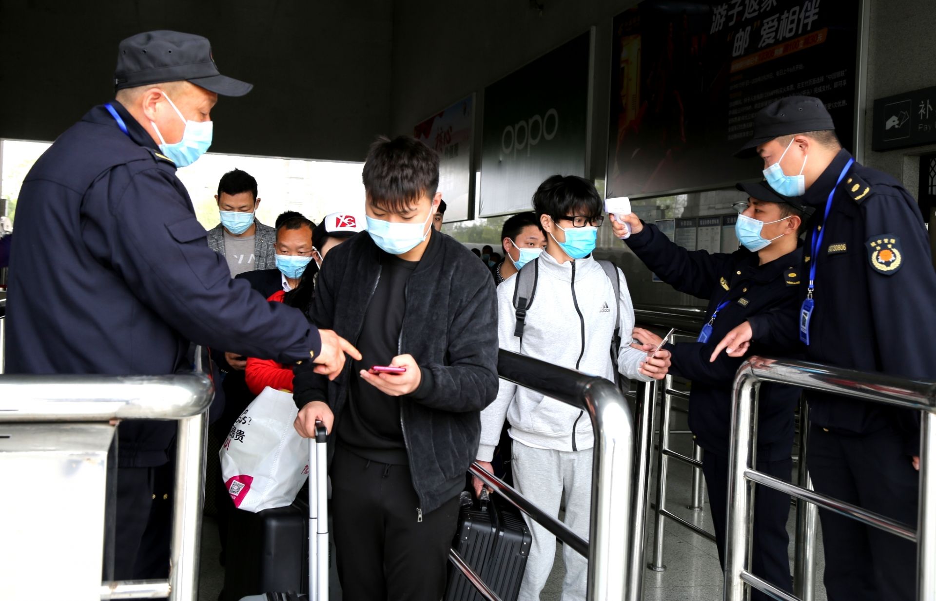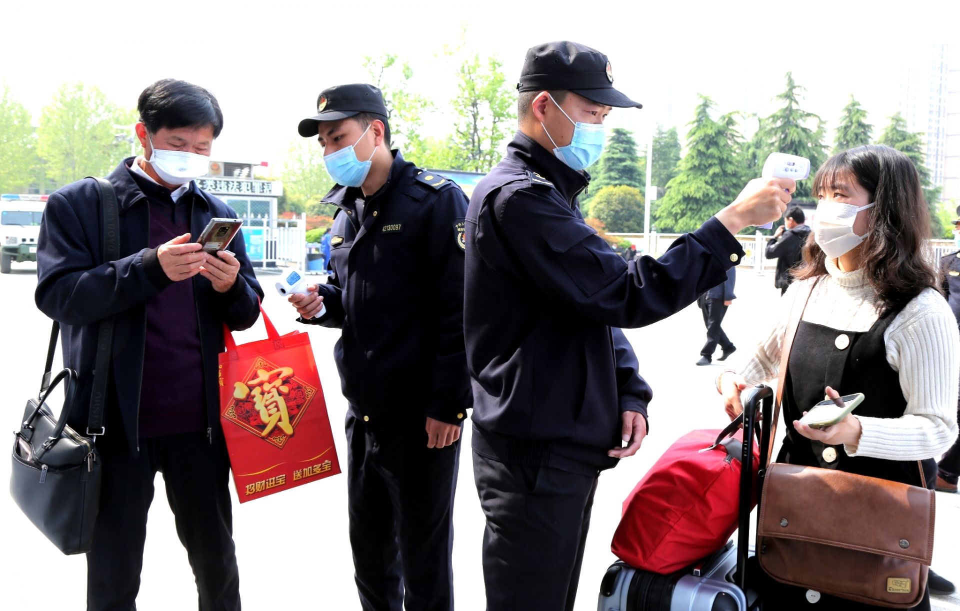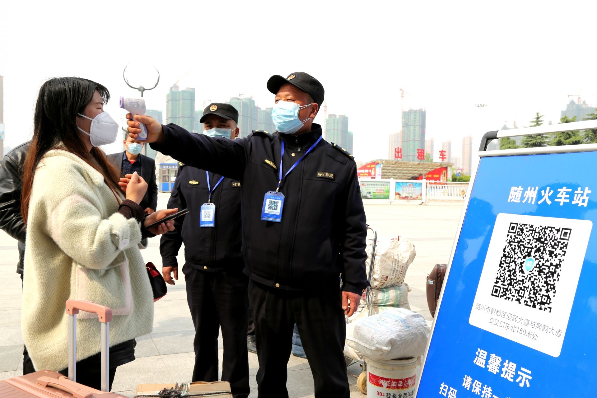 当天上午,城管执法人员在随州火车站,对首批来自武汉的旅客进行查验健康绿码和测量体温,严把外来人员乘坐火车进入随州境内关口。