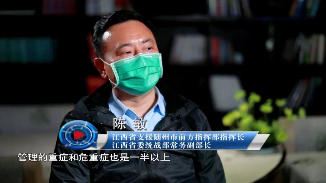 江西省支援随州市前方指挥部指挥长、江西省委统战部常务副部长 陈敏 :“ 按照随州市的统筹安排,我们整个的救治病例数将近达到了随州的一半。重症和危重症也是一半以上。”