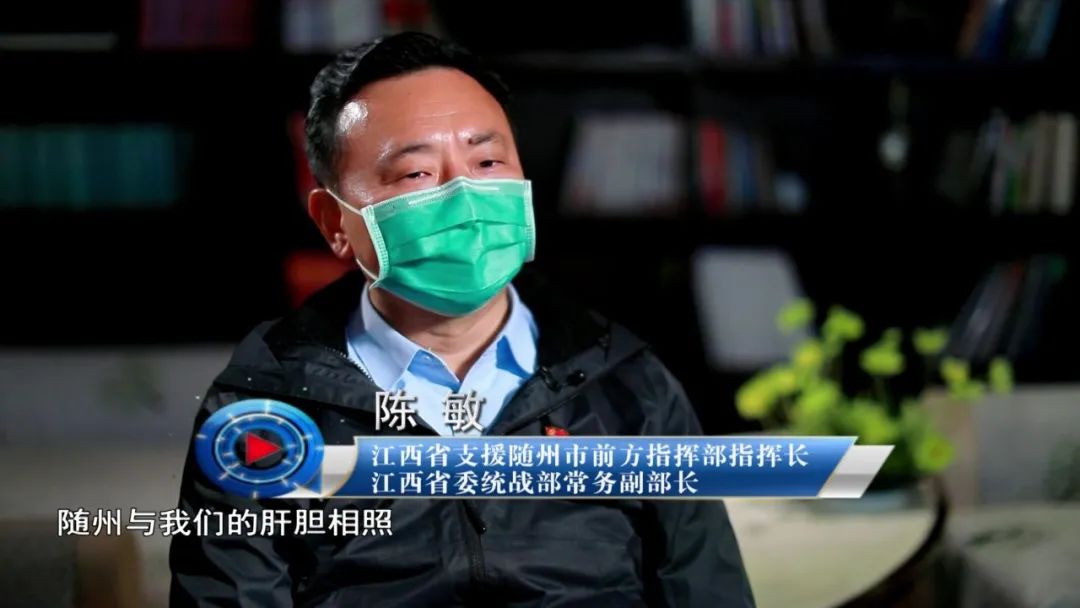 江西省支援随州市前方指挥部指挥长、江西省委统战部常务副部长 陈敏 :“ 队员们出生入死,随州与我们的肝胆相照,把自己当随州人,把随州的事当自己的事。这既体现了江西省是在完成中央交办的任务和重托,更是江西赣鄂表达一家亲的一种情怀。 ”
