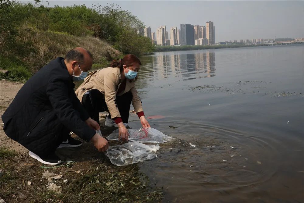 在白云湖城南新区白桃村段,一袋袋即将被放流的鱼苗被摆放在河边,随后区农业农村局工作人员将一袋袋鱼苗小心翼翼地放入水中。