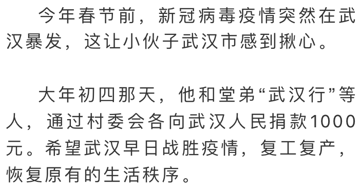 武汉市还告诉记者,他们村里汉字辈的年轻人多,他的堂弟名叫“武汉行”,比他小一岁。“武汉行”则告诉记者,父母给他取名“行”字,是希望他能成才。武汉疫情期间,他在心里默念过很多次,武汉行,一定行!