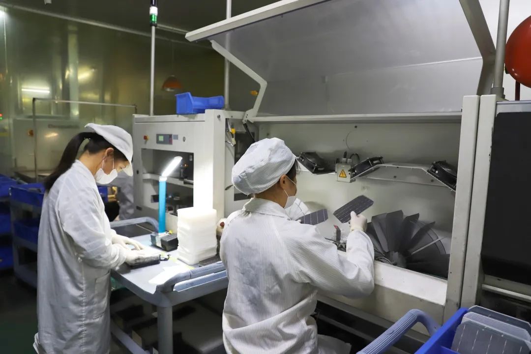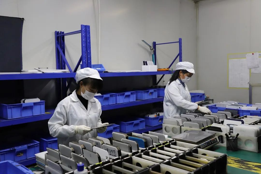 消毒,登记,测体温,戴防尘帽,穿防尘服……4月13日,记者全副武装之后,进入华昶新能源科技车间,映入眼帘的是干净整洁的环境,技术人员身着白色防尘服、戴着防尘口罩和防尘帽,在流水线上有序进行生产。