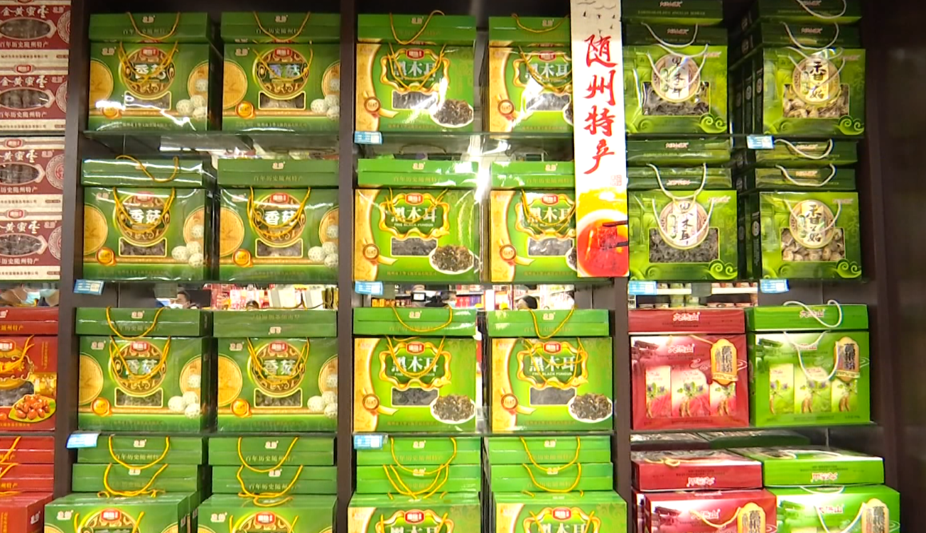 在银泰新世纪购物中心广场店可以看到,这里专门为随州本地产品开设了卖场专区,十余米长的货架装饰成青瓦白墙,两侧各悬挂一个编钟,随州特产专区充满了随州元素。