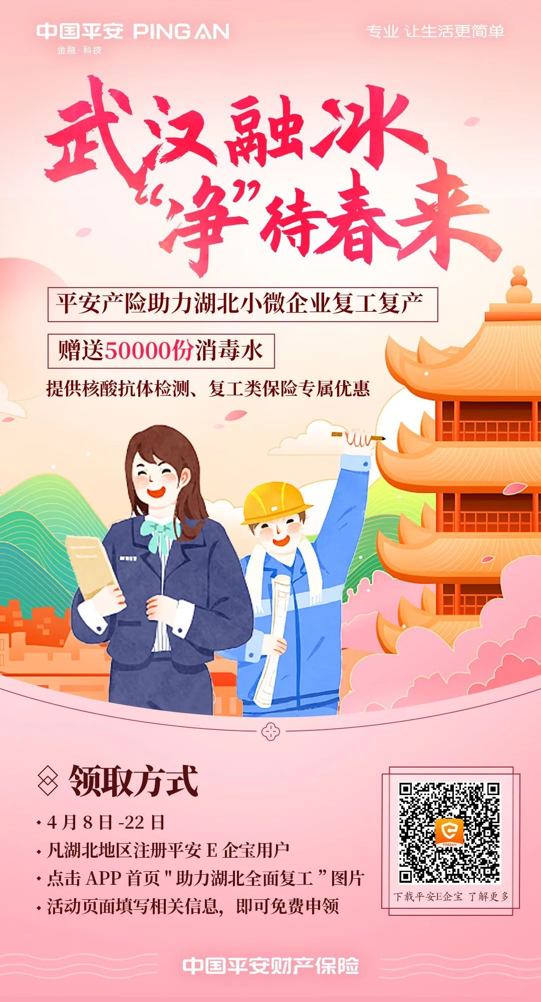 疫情期间,平安产险为湖北地区注册平安E企宝的新用户免费赠送50000份消毒液。