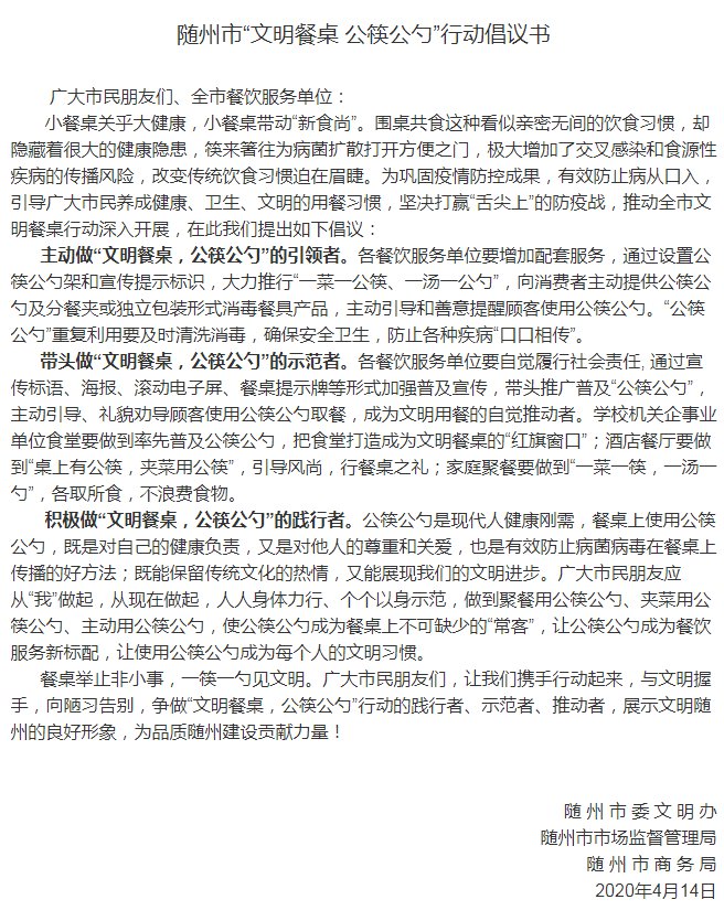 推广使用公筷公勺,餐饮服务单位、食客一个都不能少。14日,我市推出《随州市“文明餐桌 公筷公勺”行动倡议书》,号召大家从自身做起,在家庭餐桌或集体聚餐时,带头使用公筷公勺。