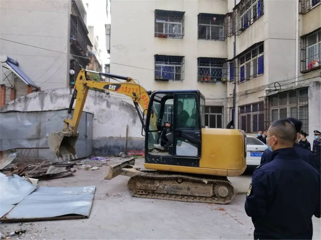 在白云湖社区,办事处联合执法人员对私搭乱建违建项目进行强制拆除,还地于民,为白云湖社区老旧小区改造项目助力。