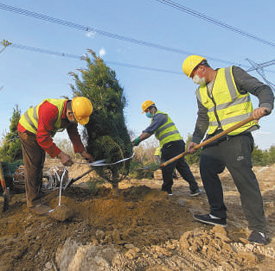 工人在河北省雄安新区容城县八于乡北河照村植树。