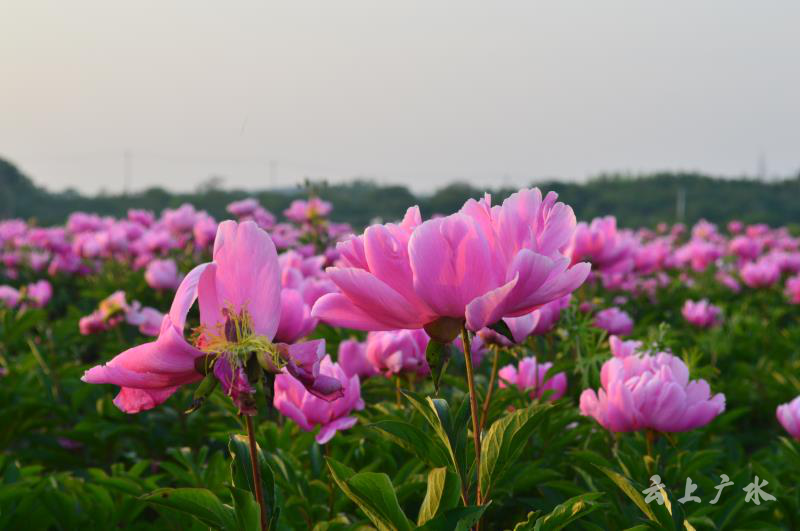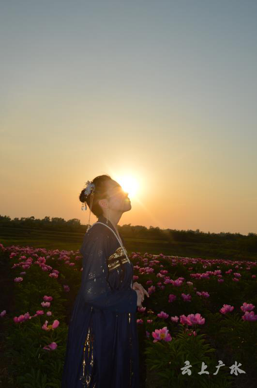 芍药花海基地里,在一部支起的手机前,一名身穿汉服的女子,手持圆团扇,侧身半回眸,面露梨花笑,时而兰花指摆在胸前,时而纱巾掩面,时而作细嗅花状,简直就是人与花相融般美轮美奂的“视观图”。