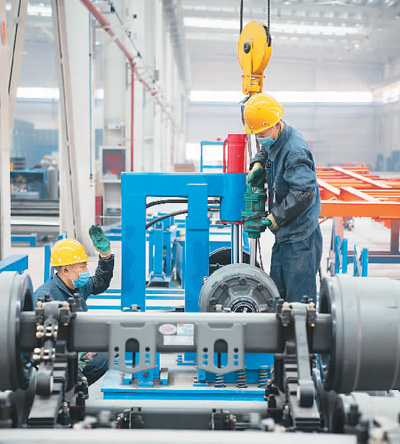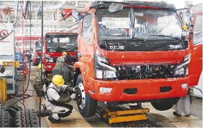5月3日,位于湖北省襄阳市的东风汽车股份有限公司工程车事业部二总装车间里一派热火朝天的景象,为赶生产任务,工程车事业部每天排产近100台,达同期产能水平150%。图为装配工人正在紧张地忙碌。王 虎摄(人民视觉)