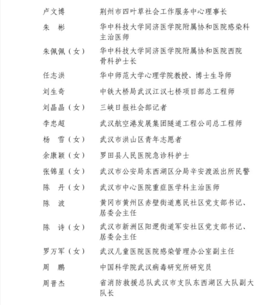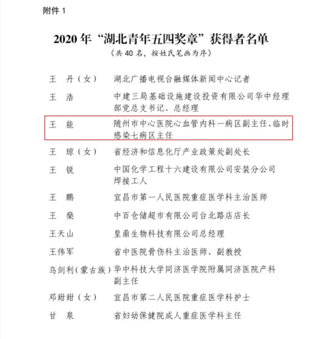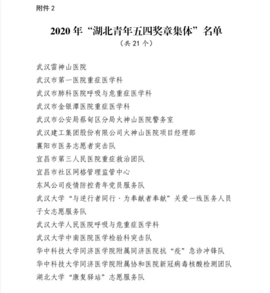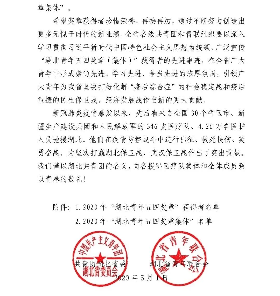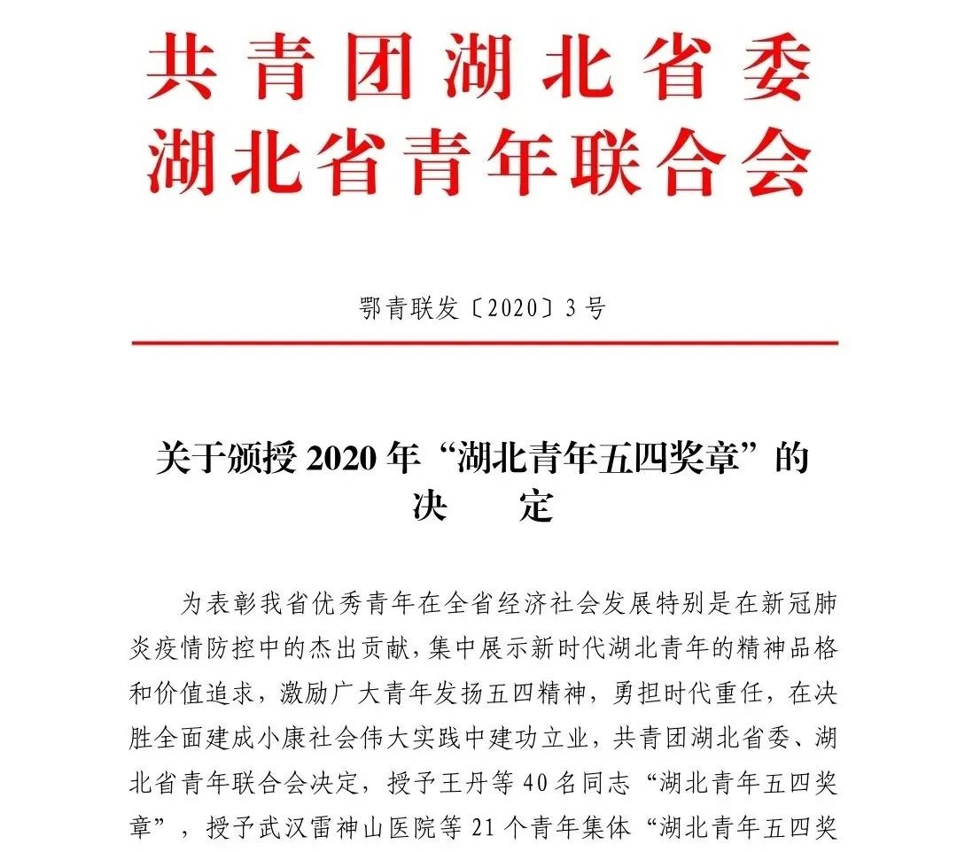 为表彰我省优秀青年在全省经济社会发展特别是在新冠肺炎疫情防控中的杰出贡献,集中展示新时代湖北青年的精神品格和价值追求,激励广大青年发扬五四精神,勇担时代重任,在决胜全面建成小康社会伟大实践中建功立业,共青团湖北省委、湖北省青年联合会决定,授予王丹等40名同志“湖北青年五四奖章”,授予武汉雷神山医院等21个青年集体“湖北青年五四奖章集体”。