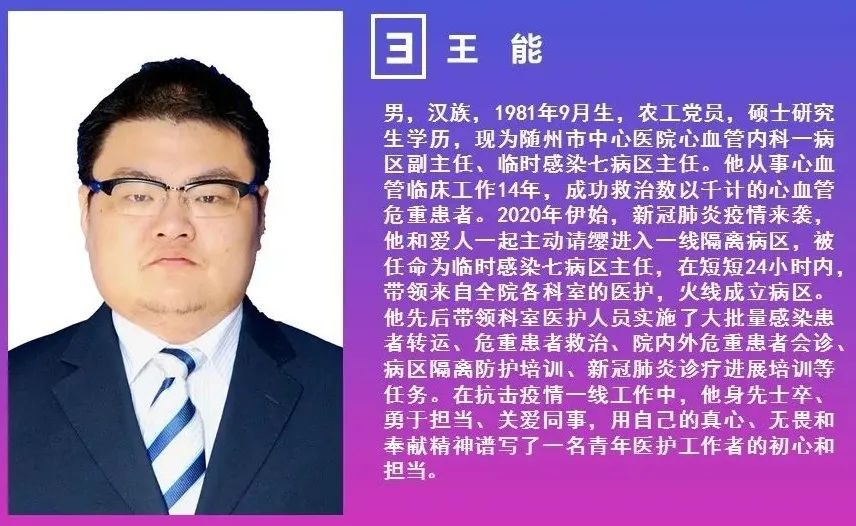 王能,1981 年 9 月出生,中国农工民主党党员,现任随州市中心医院心血管内科一病区副主任。