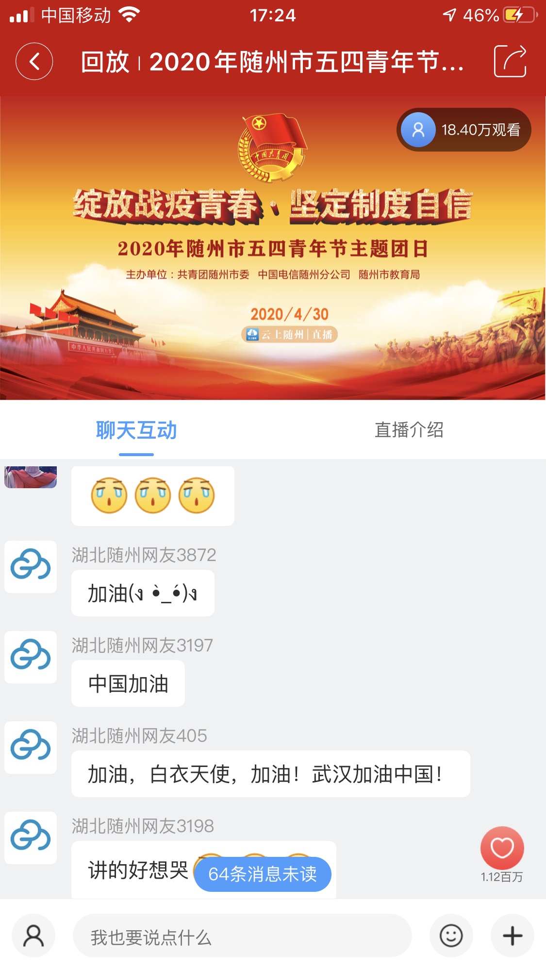 五四前夕,随州市“绽放战疫青春·坚定制度自信”主题团日活动通过云上随州进行直播,抗疫一线的青年代表面对镜头分享自己的感人故事,引得无数网友感动落泪,他们纷纷在直播间留言,表达敬意!