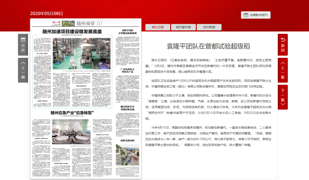 该团队正在实施亩产1200公斤的超级杂交水稻超高产攻关试验项目。项目由袁隆平院士主持,中植同惠生物工程(湖北)有限公司联合随州市、曾都区两级农业农村部门共同实施。