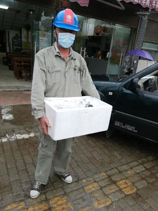5月7日,一个戴着口罩的年轻女孩拎着用铝箔纸严严实实盖着的包装盒,来到距离随州市曾都经济开发区两水沟风灾抢修施工现场不远的休息场地。