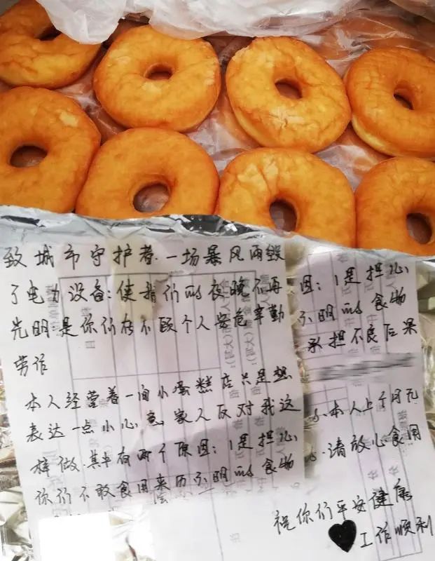 “你们是电力施工人员吗?这是我的一点小小心意,送给你们。”简单说明来意,小女孩把包装盒从车窗里一把塞到了坐在工程车驾驶位湖北随州两水供电所员工龚海涛手里,扭头就跑。龚海涛刚下车准备叫住女孩,转眼间已找不着。他把盒子打开,里面是热乎乎的蛋糕和一纸留言,正纳闷的他仔细一看内容,不由得露出了微笑,连续两天抢修工作的倦意仿佛一瞬间烟消云散。纸条上娟秀的字迹:“致城市守护者:一场暴风雨毁了电力设备,使我们的夜晚不再光明,是你们不顾个人安危辛勤劳作。本人经营着一间小蛋糕店只是想表达一点心意,这些食物都是干净的,请放心食用。祝平安健康!”