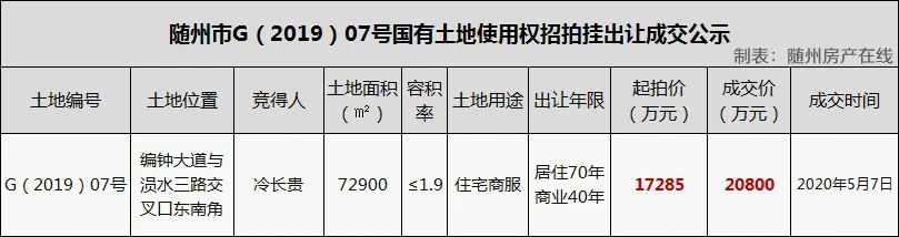 据了解,随州市G(2019)07号位于城南编钟大道与涢水三路交叉口东南角。该地块总面积72900平方米(约109.35亩),起拍价为1亿7285万元,成交价为2亿零800万元,溢价率为20.34%(注:地面价约2853.22元/平方米,按最大容积率1.9计算,楼面价约为1501.7元/平方米)。