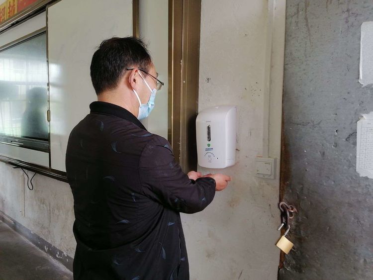 2、进入教室第一步通过免洗手感应器进行消毒。