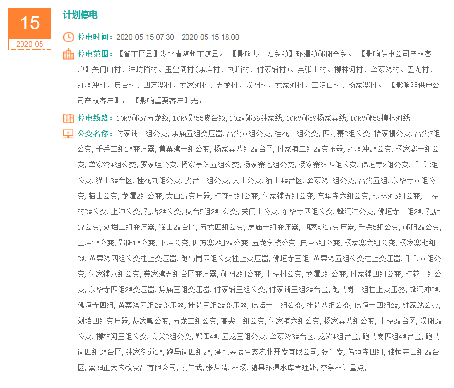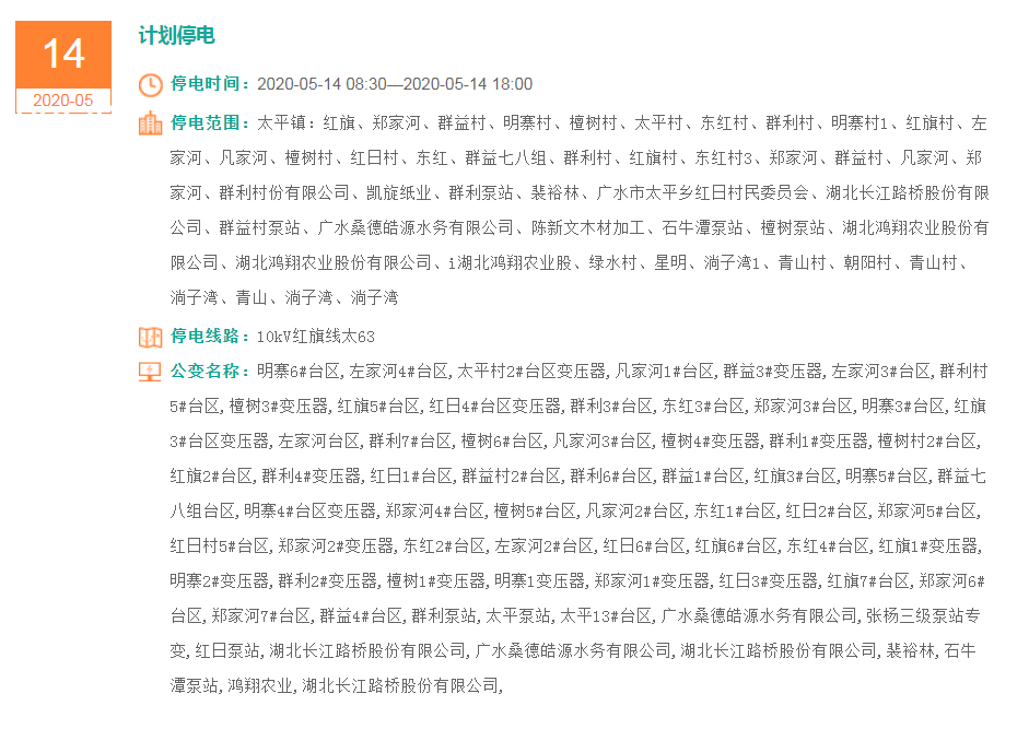 停电范围:太平镇:红旗、郑家河、群益村、明寨村、檀树村、太平村、东红村、群利村、明寨村1、红旗村、左家河、凡家河、檀树村、红日村、东红、群益七八组、群利村、红旗村、东红村3、郑家河、群益村、凡家河、郑家河、群利村份有限公司、凯旋纸业、群利泵站、裴裕林、广水市太平乡红日村民委员会、湖北长江路桥股份有限公司、群益村泵站、广水桑德皓源水务有限公司、陈新文木材加工、石牛潭泵站、檀树泵站、湖北鸿翔农业股份有限公司、湖北鸿翔农业股份有限公司、i湖北鸿翔农业股、绿水村、星明、淌子湾1、青山村、朝阳村、青山村、淌子湾、青山、淌子湾、淌子湾