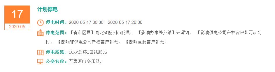 停电范围:【省市区县】湖北省随州市随县。【影响办事处乡镇】环潭镇。【影响供电公司产权客户】万家河村。【影响非供电公司产权客户】无。【影响重要客户】无。