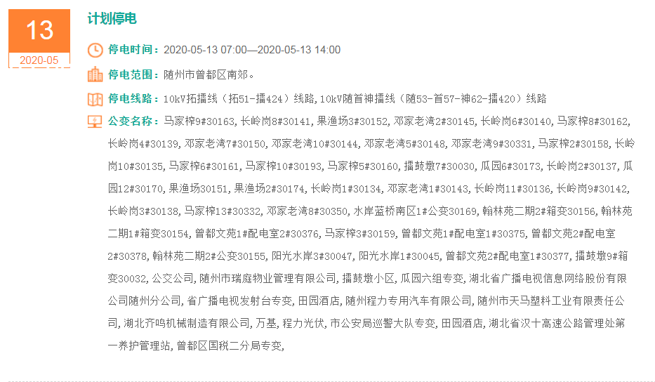 停电范围:随州市曾都区南郊。