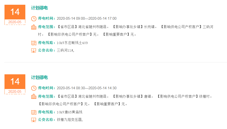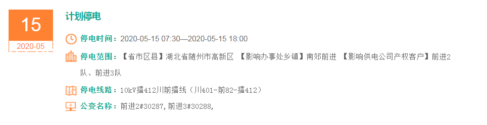 停电范围:【省市区县】湖北省随州市高新区 【影响办事处乡镇】南郊前进 【影响供电公司产权客户】前进2队、前进3队