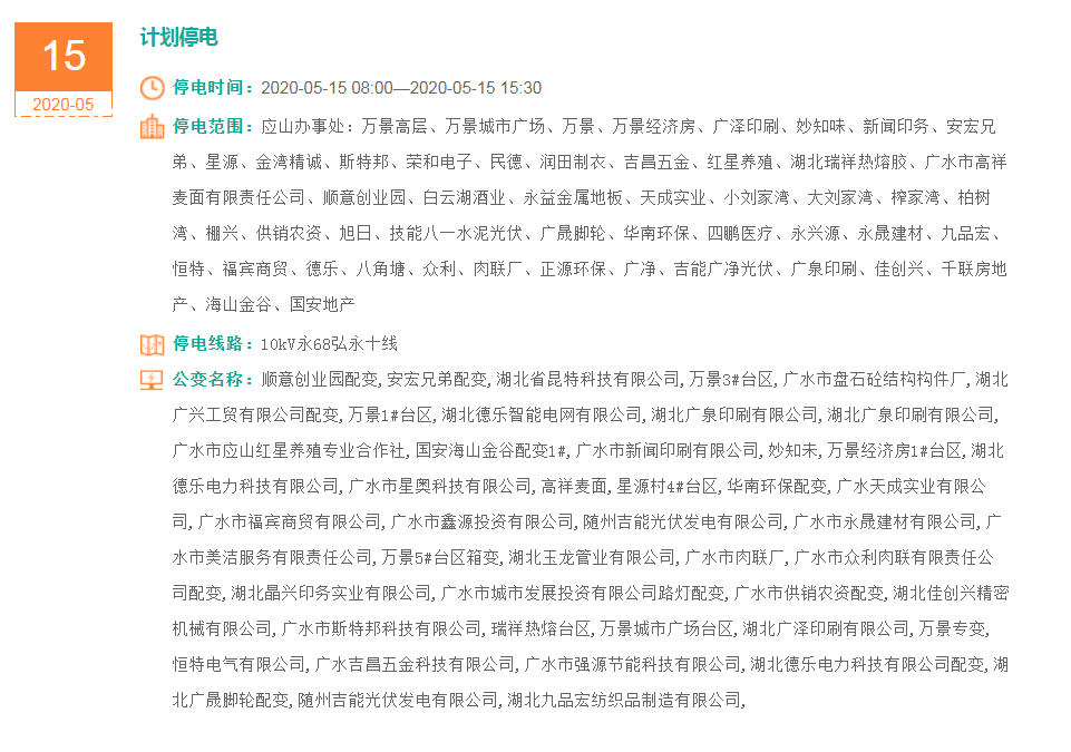 停电范围:应山办事处:万景高层、万景城市广场、万景、万景经济房、广泽印刷、妙知味、新闻印务、安宏兄弟、星源、金湾精诚、斯特邦、荣和电子、民德、润田制衣、吉昌五金、红星养殖、湖北瑞祥热熔胶、广水市高祥麦面有限责任公司、顺意创业园、白云湖酒业、永益金属地板、天成实业、小刘家湾、大刘家湾、榨家湾、柏树湾、棚兴、供销农资、旭日、技能八一水泥光伏、广晟脚轮、华南环保、四鹏医疗、永兴源、永晟建材、九品宏、恒特、福宾商贸、德乐、八角塘、众利、肉联厂、正源环保、广净、吉能广净光伏、广泉印刷、佳创兴、千联房地产、海山金谷、国安地产