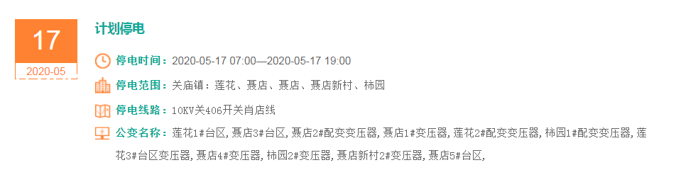 停电范围:关庙镇:莲花、聂店、聂店、聂店新村、柿园