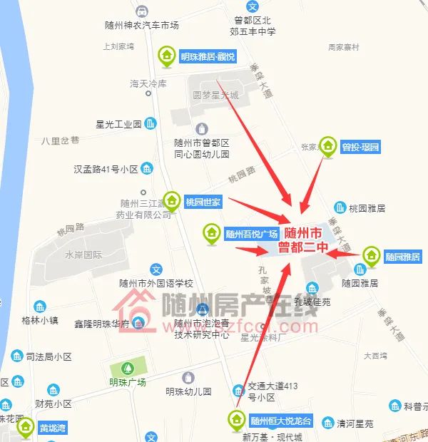 由于随州二中位于市中心,周边没有在售的楼盘,距离相对较近的楼盘也不多。