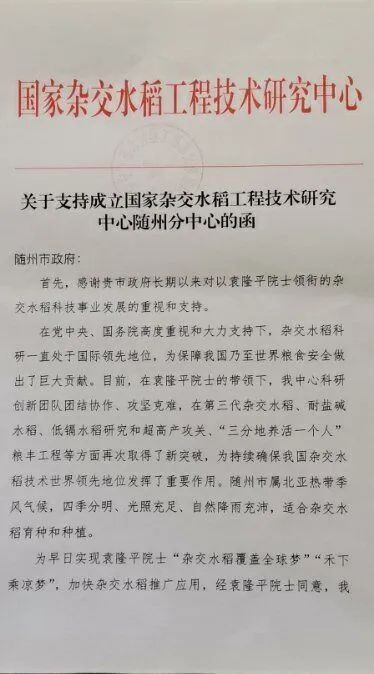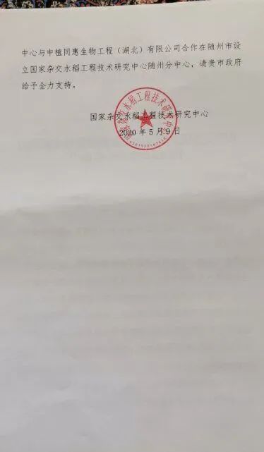 5月9日,袁隆平院士亲笔签批,同意国家杂交水稻工程技术研究中心布点随州,与曾都区中植同惠生物工程(湖北)有限公司共建随州分中心,深入开展杂交水稻高产研发。