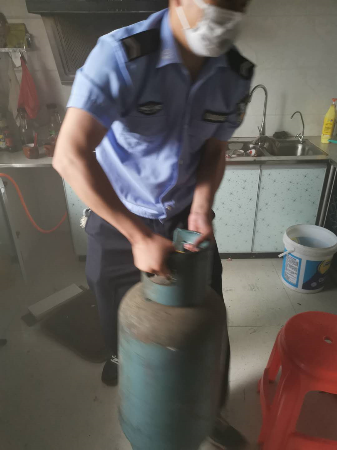 民警首先对围观群众进行疏散,随后拿起灭火器冲进屋内关闭电源总闸。到达厨房后,发现厨房的灶台和油烟机已经起火燃烧,民警立即对起火部位进行扑救。为防止火灾扩大引发事故,辅警隗海瑞徒手将炙热的煤气坛搬至屋外安全处,进行降温处置。由于出警迅速、处置及时,火灾被成功扑灭,未造成人员伤亡。此时隗海瑞才发现手掌已被高温灼伤,起了水泡,面对房主的感谢,他笑道:“幸亏没有酿成大火,这点伤不算什么。”