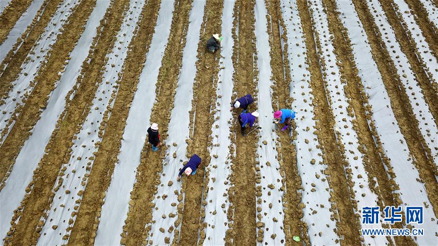 村民在贵州省榕江县车江大坝万亩蔬菜示范基地铺设地膜栽种早熟蔬菜(4月3日摄,无人机照片)。新华社记者 杨文斌 摄