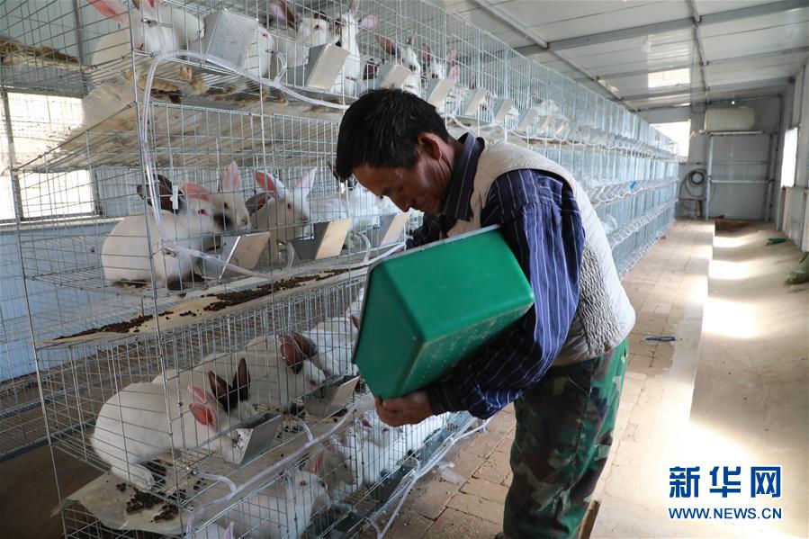 4月8日,甘肃省镇原县方山乡贾山村低保户杨明世在给家里饲养的肉兔喂食。新华社记者 胡伟杰 摄