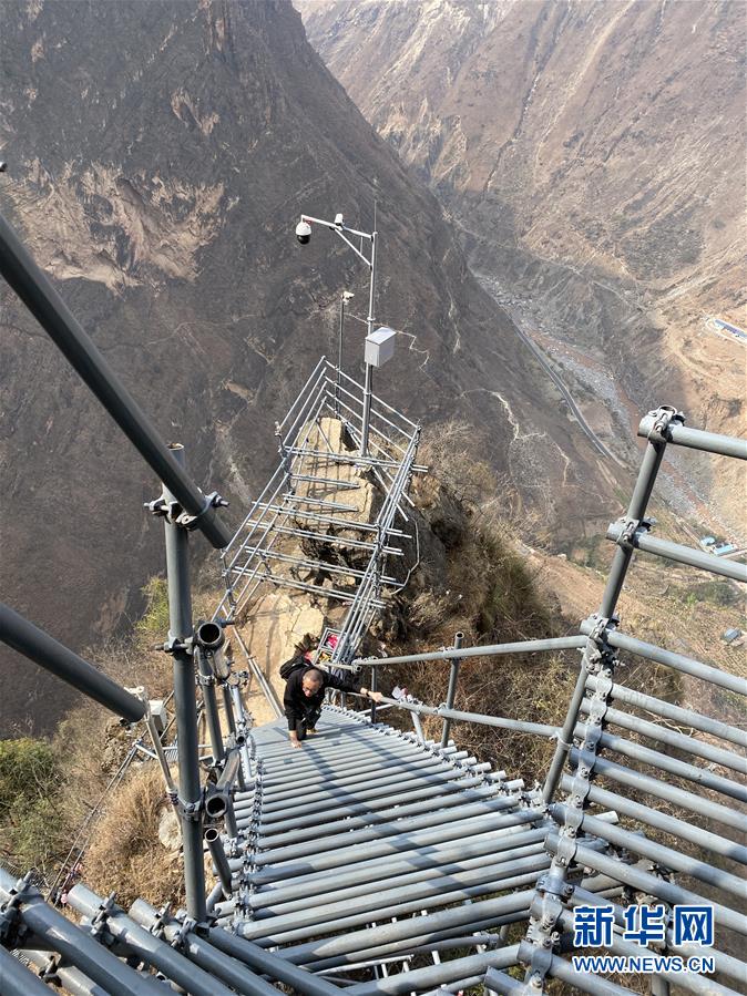 3月23日,一名游客在四川凉山州“悬崖村”攀爬钢梯,他身后是为了保障安全安装的视频监控系统。新华社记者 吴光于 摄
