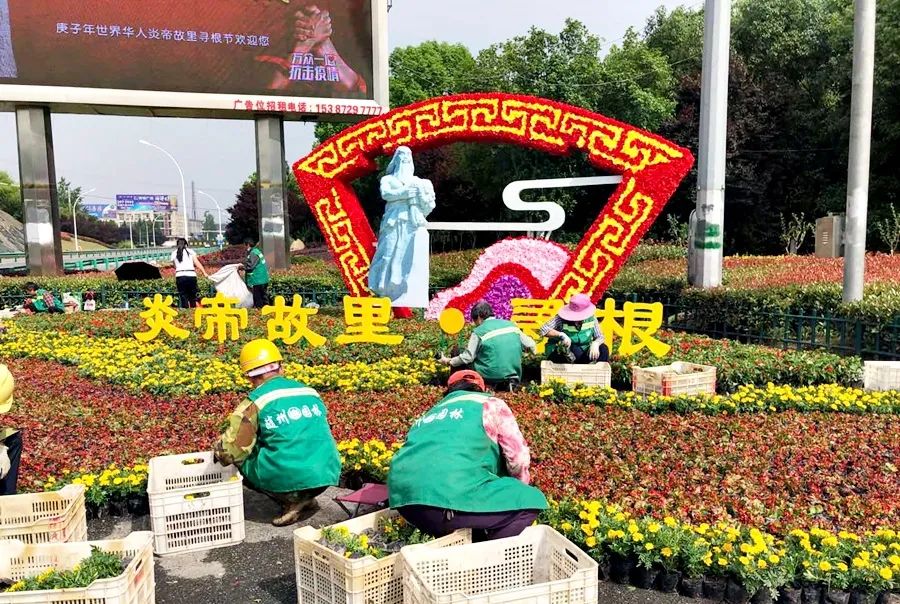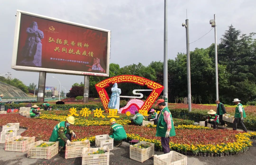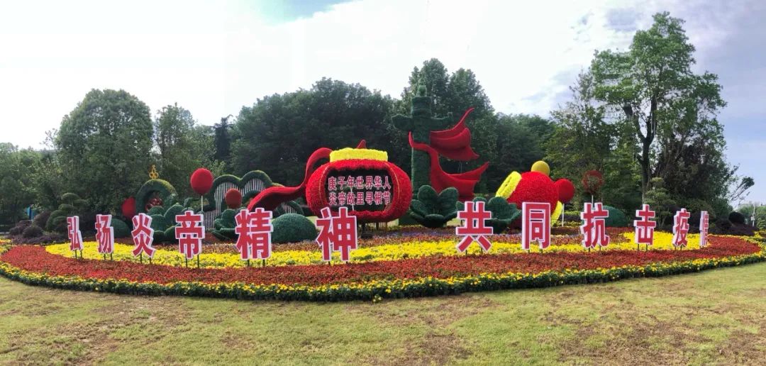 目前,白云公园管理处已摆放鲜花约20万盆,制作绢花8000余朵,在府河大桥悬挂大红灯笼和中国结等,通过摆花布景造型,突出“弘扬炎帝精神,共同抗击疫情”主题,打造出喜庆独特的节日景观效果。