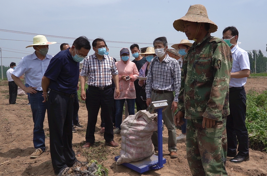 随后,肖长惜一行来到唐县镇新桥村试验示范基地,察看马铃薯品种、种植、长势等情况。在马铃薯产业扶贫种植示范田,专家组随机选取三块样点,进行现场实收取样测产。验收结果显示,“华薯1号”亩产4086.7公斤,比对照的样薯增收23%。专家组经过现场测产鉴定和评议,一致认为,随县技术示范区对覆膜栽培、施肥除虫等高产高效技术的应用,措施到位,马铃薯长势均衡,无明显病虫危害,马铃薯增产效果相当显著。