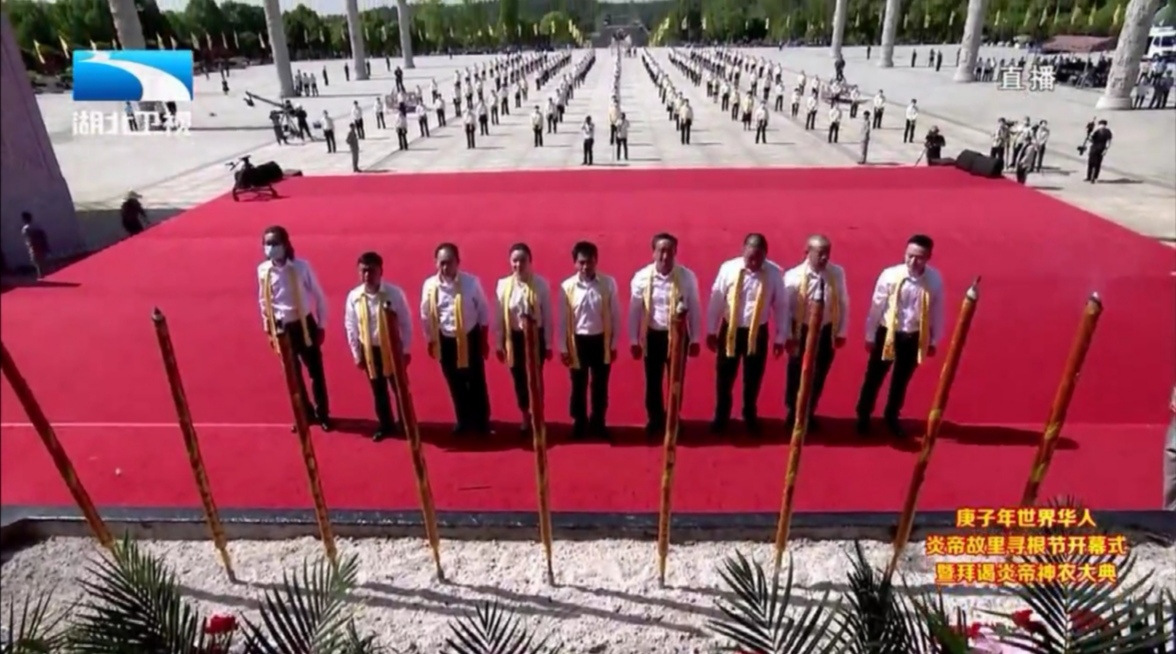 每年农历四月廿六,是华夏始祖炎帝神农的诞辰纪念日,湖北随州都会举办世界华人炎帝故里寻根节。今年寻根节突出“弘扬炎帝精神,共同抗击疫情”的主题,简化具体流程,控制现场人员规模,开设网上拜祖平台。当天,第六项议程,由台胞代表、侨胞代表、防疫一线人员代表、脱贫攻坚代表、企业家代表共计9人敬献高香,杨曙光就是脱贫攻坚代表之一。