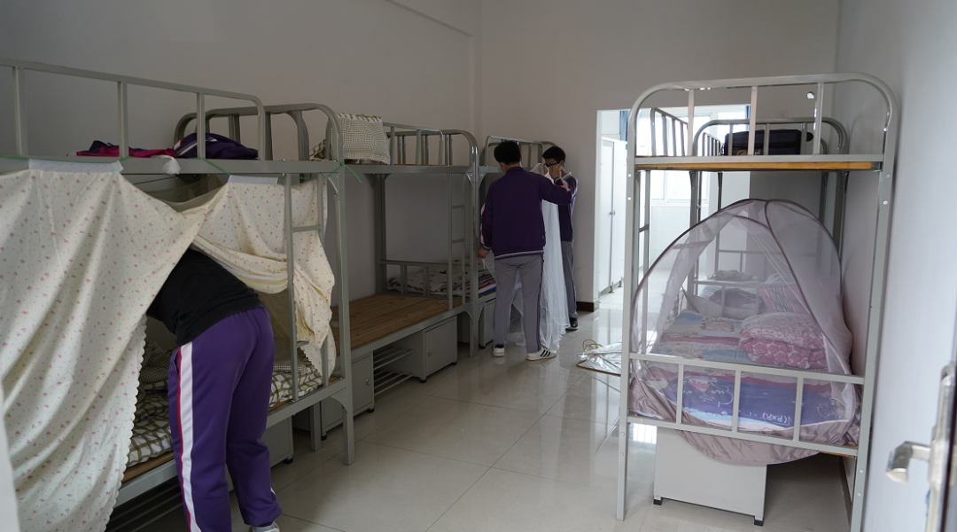 记者采访时看到,宿舍楼门口也设立了防疫测温点,学生出入宿舍需登记并测量体温。住宿标准由一寝10人改为一寝居住3至4人,床位采用交错而住的形式,避免学生近距离接触。宿舍楼还设立了专门用于发热症状教职工、学生的隔离室,全力保障师生安全。食堂内,各种间隔、指示标志明显,通过实行错峰用餐、间隔排队、分散就座的方式,确保学生就餐安全有序。