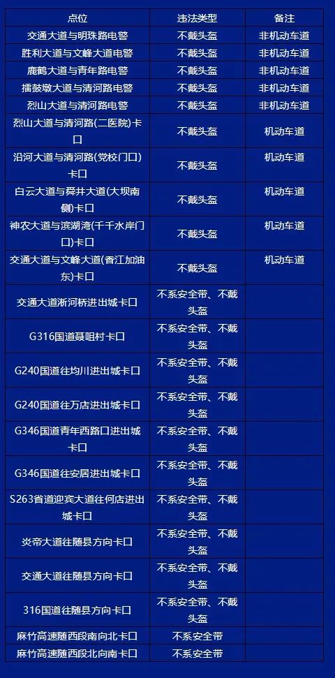 根据《湖北省“一盔一带”安全守护行动方案》的要求,为进一步增强摩托车和电动自行车骑乘人员佩戴安全头盔、汽车驾乘人员使用安全带的意识,全面提升摩托车、电动自行车骑乘人员和汽车驾乘人员安全防护水平,减轻交通事故后果,减少交通事故伤亡,依据《中华人民共和国道路交通安全法》第一百一十四条之规定,随州市公安局交通警察支队决定:自2020年5月25日开始,启用智能交通综合管控系统对不系安全带和不戴头盔交通违法行为的自动抓拍上网功能,请广大驾驶人员自觉遵守交通法规,文明出行。一期启动具体点位如下,随后扩展建设启动城区其他点位。